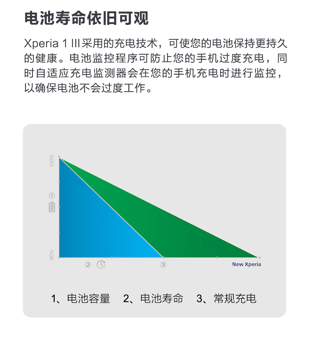 Xperia 1 III 采用的充电技术,可使您的电池保持更持久的健康。电池监控程序可防止您的手机过度充电,同时自适应充电监测器会在您的手机充电时进行监控,避免电池过充带来的损耗。