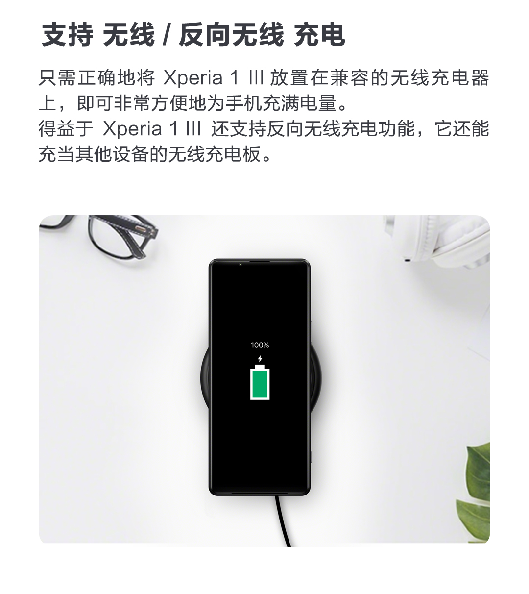 只需正确地将 Xperia 1 III 放置在兼容的无线充电器上,即可非常方便地为手机充满电量。得益于 Xperia 1 III 还支持反向无线充电功能,它还能充当其他设备的无线充电板。