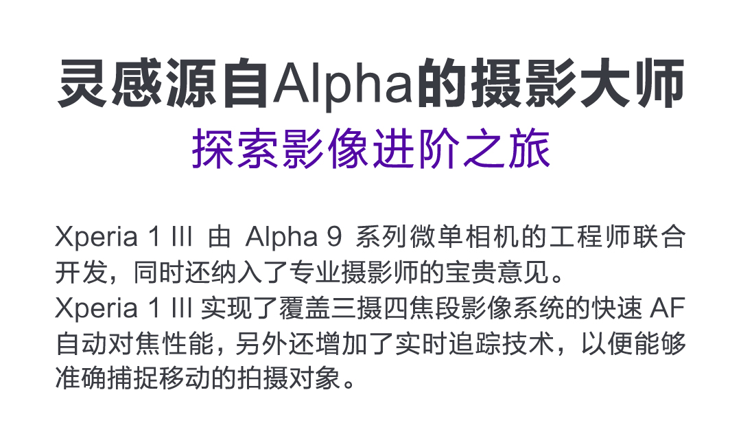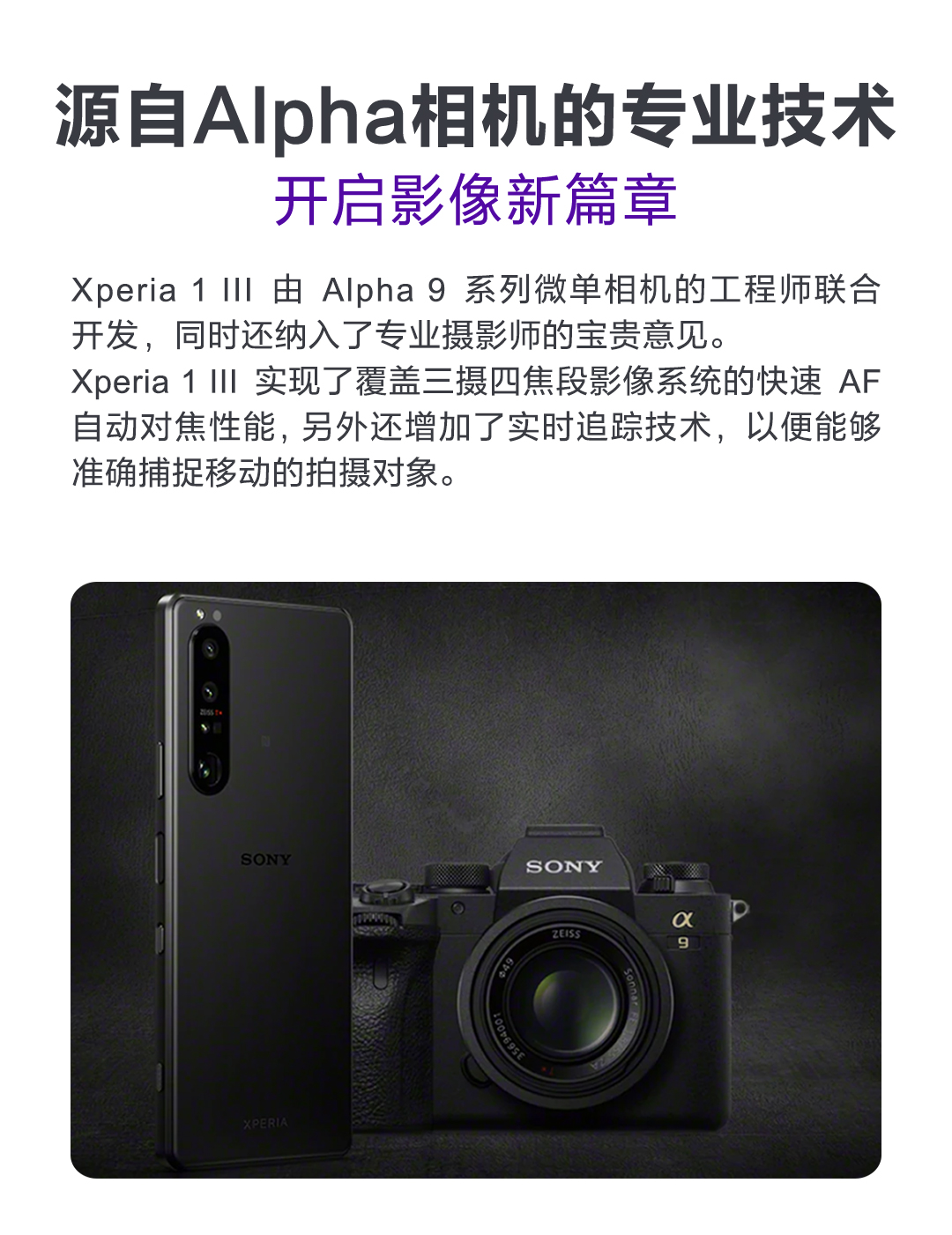 Alpha 9 系列微单相机,一贯以快速的自动对焦技术闻名业界,Xperia 1 III 正是由其工程师联合开发,同时还纳入了为改善摄影体验以及成片效果做出贡献的专业摄影师的宝贵意见。主要包括覆盖三摄四焦段影像系统的快速 AF 自动对焦性能,另外还增加了实时追踪技术,以便能够准确捕捉移动的拍摄对象。