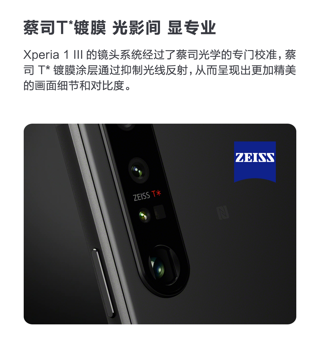 Xperia 1 III 的镜头系统经过了蔡司光学的专门校准,蔡司T*镀膜涂层通过抑制光线反射,从而呈现出更加精美的画面细节和对比度。