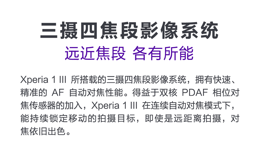 Xperia 1 III 所搭载的三摄四焦段影像系统,配合快速、精准的 AF 自动对焦,让您能够尽情挥洒影像创意。得益于双核 PDAF 相位对焦传感器的加入,在连续自动对焦模式下,Xperia 1 III 能持续锁定移动的拍摄目标。即使是远距离拍摄,索尼的远摄镜头依然可以实现快速的 AF 自动对焦。