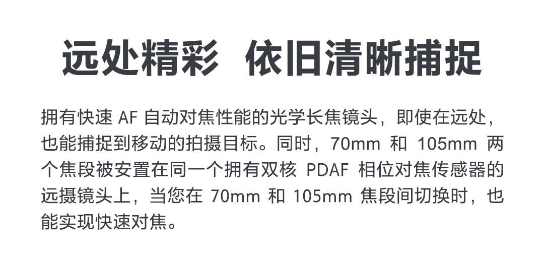 Xperia 1 III 拥有快速AF自动对焦性能的光学长焦镜头,即使在远处,也能捕捉到移动的拍摄目标。同时,70mm 和 105mm 两个焦段被安置在同一个拥有双核 PDAF 相位对焦传感器的远摄镜头上。因此,当您在 70mm 和 105mm 焦段间切换时,焦距调节镜片和AF自动对焦镜片能够通过协同工作,实现快速对焦。