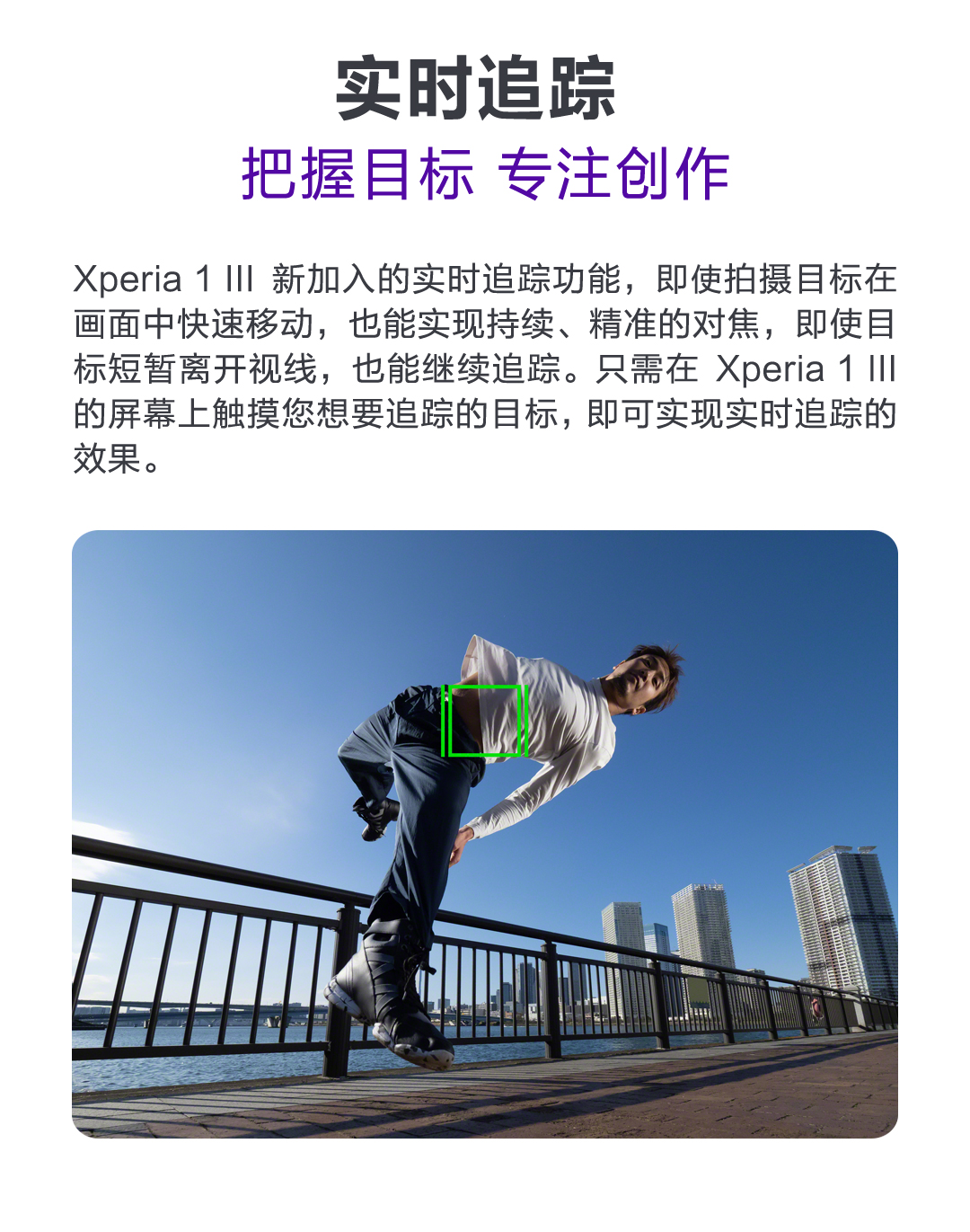 Xperia 1 III 新加入的实时追踪功能,即使拍摄目标在画面中快速移动,也能实现持续、精准的对焦。实时追踪功能通过借助 AI 技术和 3D iToF 传感器测量与被摄目标的距离,从而精确地检测并聚焦目标,即使目标短暂离开视线,也能继续追踪。只需在屏幕上触摸您想要追踪的目标,即可实现实时追踪的效果。