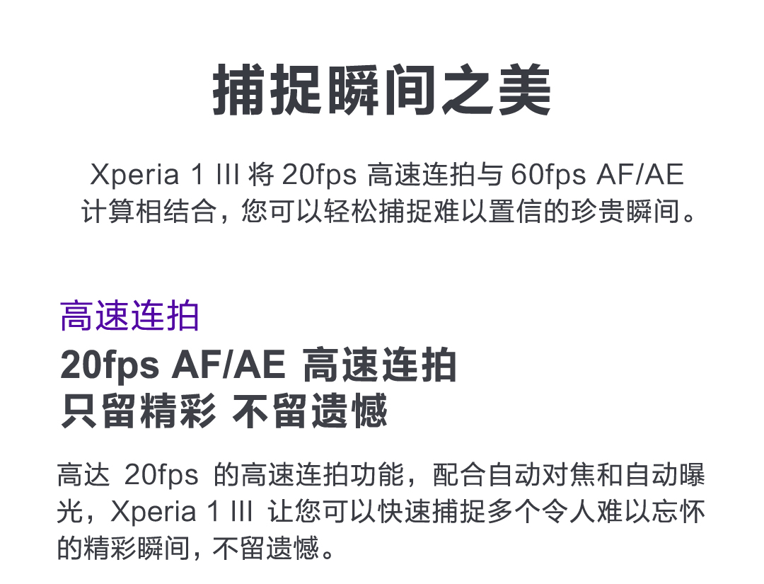 高达 20fps 的高速连拍功能,配合自动对焦和自动曝光,Xperia 1 III 让您可以快速捕捉多个令人难以忘怀的精彩瞬间,不留遗憾。