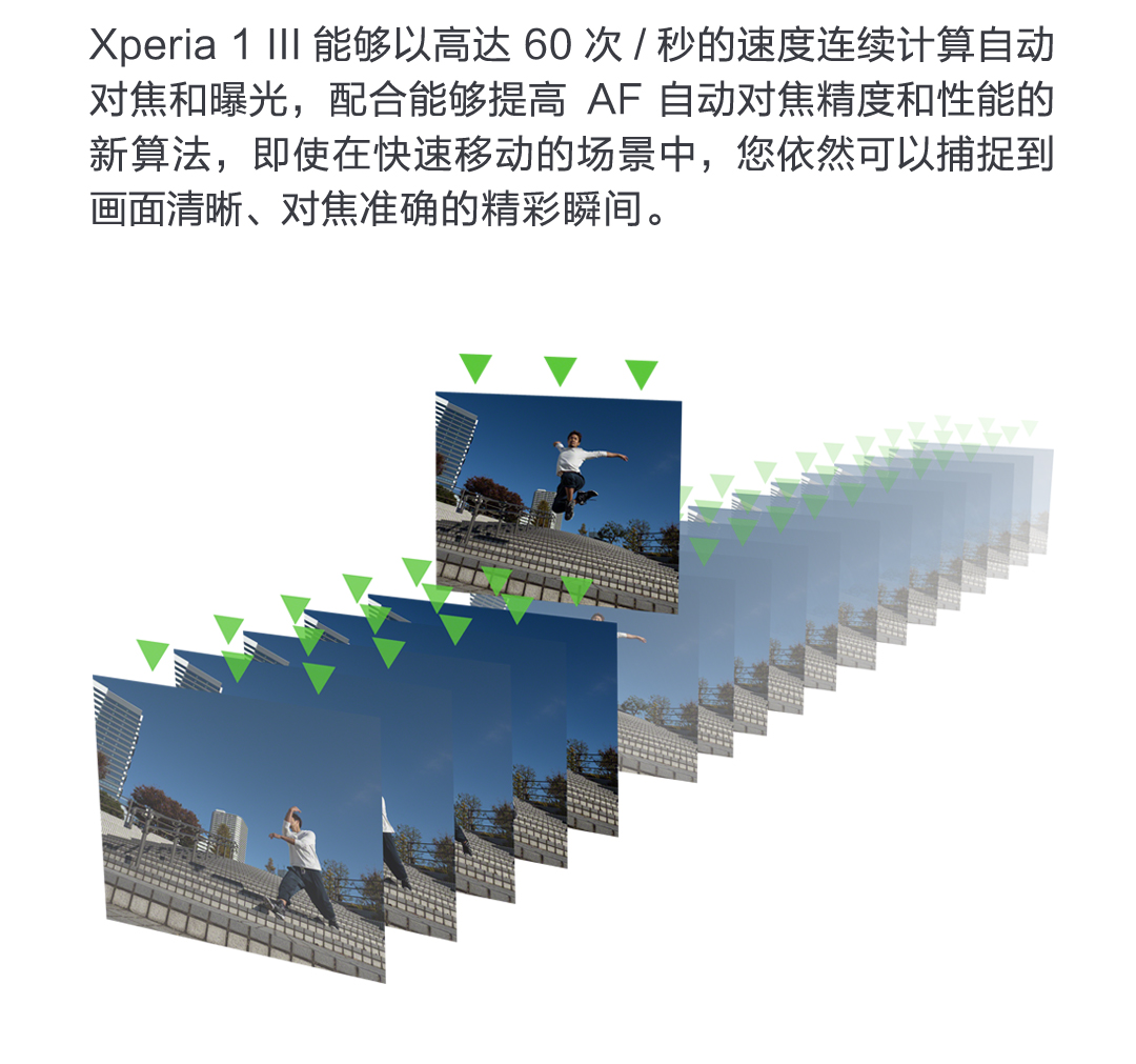 Xperia 1 III 能够以高达 60 次/秒的速度连续计算自动对焦和曝光,配合能够提高AF自动对焦精度和性能的新算法,即使在快速移动的场景中,您依然可以捕捉到画面清晰、对焦准确的精彩瞬间。