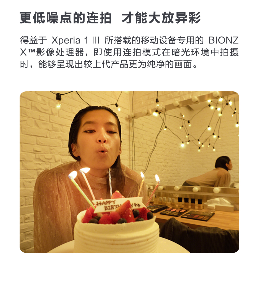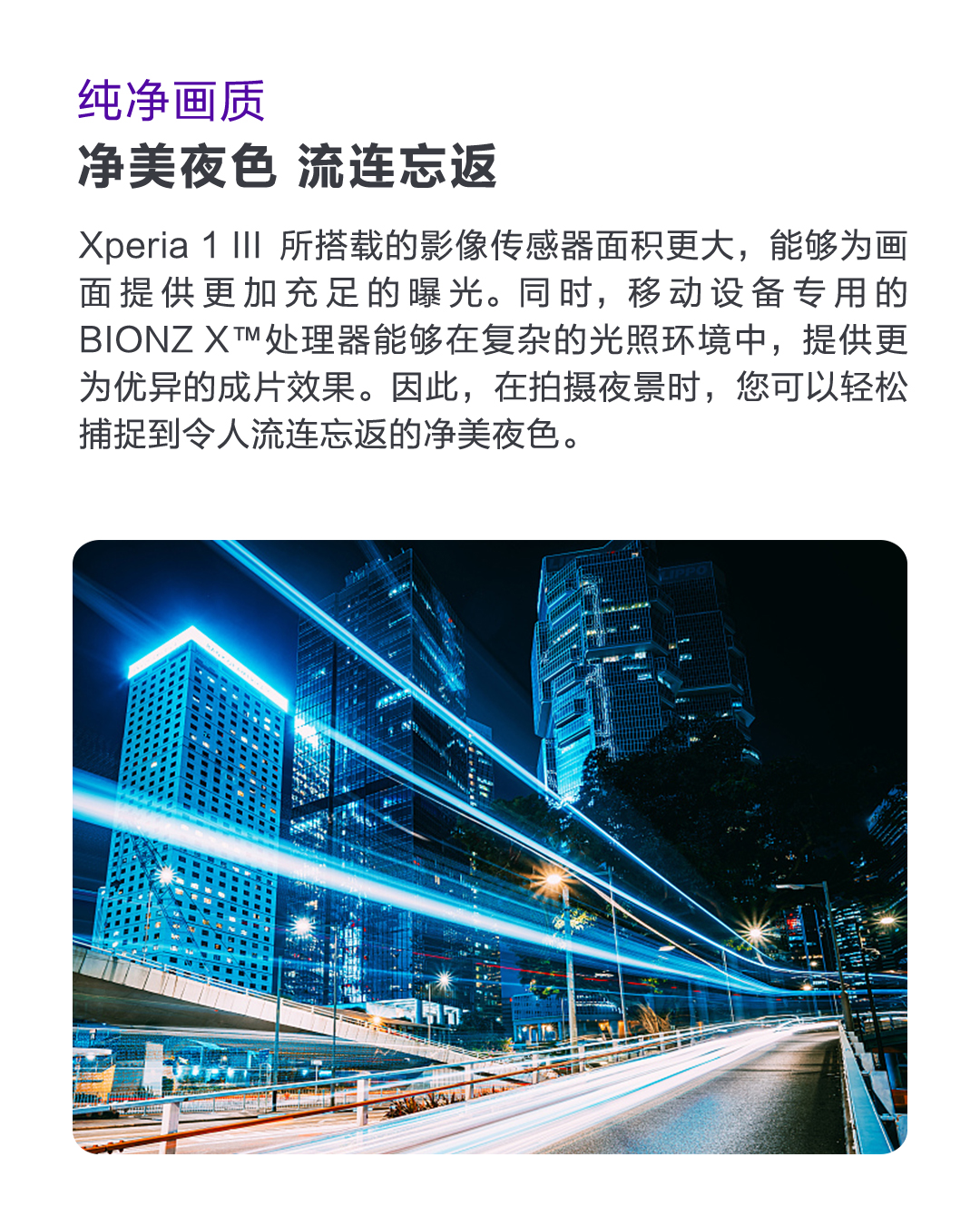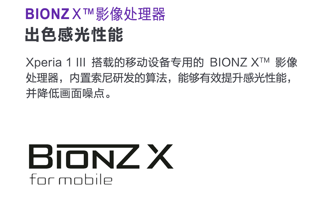Xperia 1 III 搭载的移动设备专用的 BIONZ X™ 影像处理器,内置索尼研发的算法,能够有效提升感光性能,并降低画面噪点。