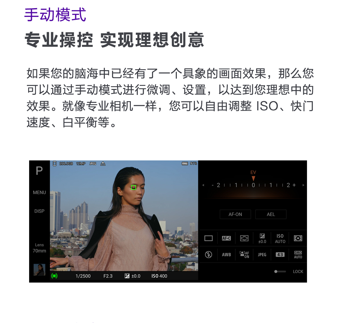 如果您的脑海中已经有了一个具象的画面效果,那么您可以通过手动模式进行微调、设置,以达到您理想中的效果。就像专业相机一样,您可以自由调整 ISO 、快门速度、白平衡等。