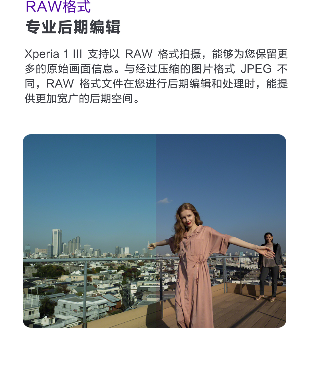 Xperia 1 III 支持以 RAW 格式拍摄,能够为您保留更多的原始画面信息。与经过压缩的图片格式JPEG不同,RAW格式文件在您进行后期编辑和处理时,能提供更加宽广的后期空间。