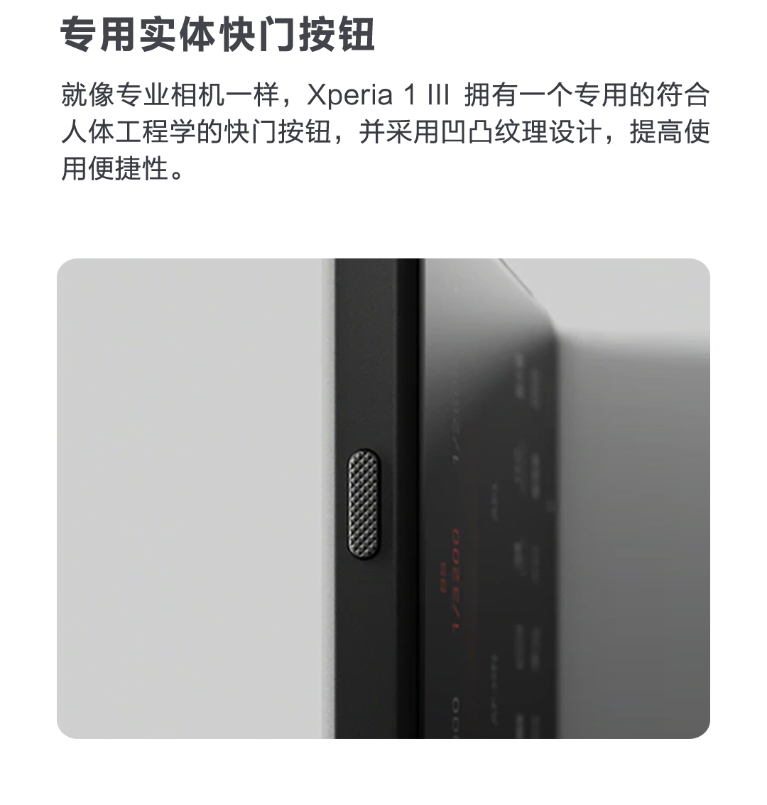 就像专业相机一样,Xperia 1 III 拥有一个专用的符合人体工程学的快门按钮,并采用凹凸纹理设计,提高使用便捷性。