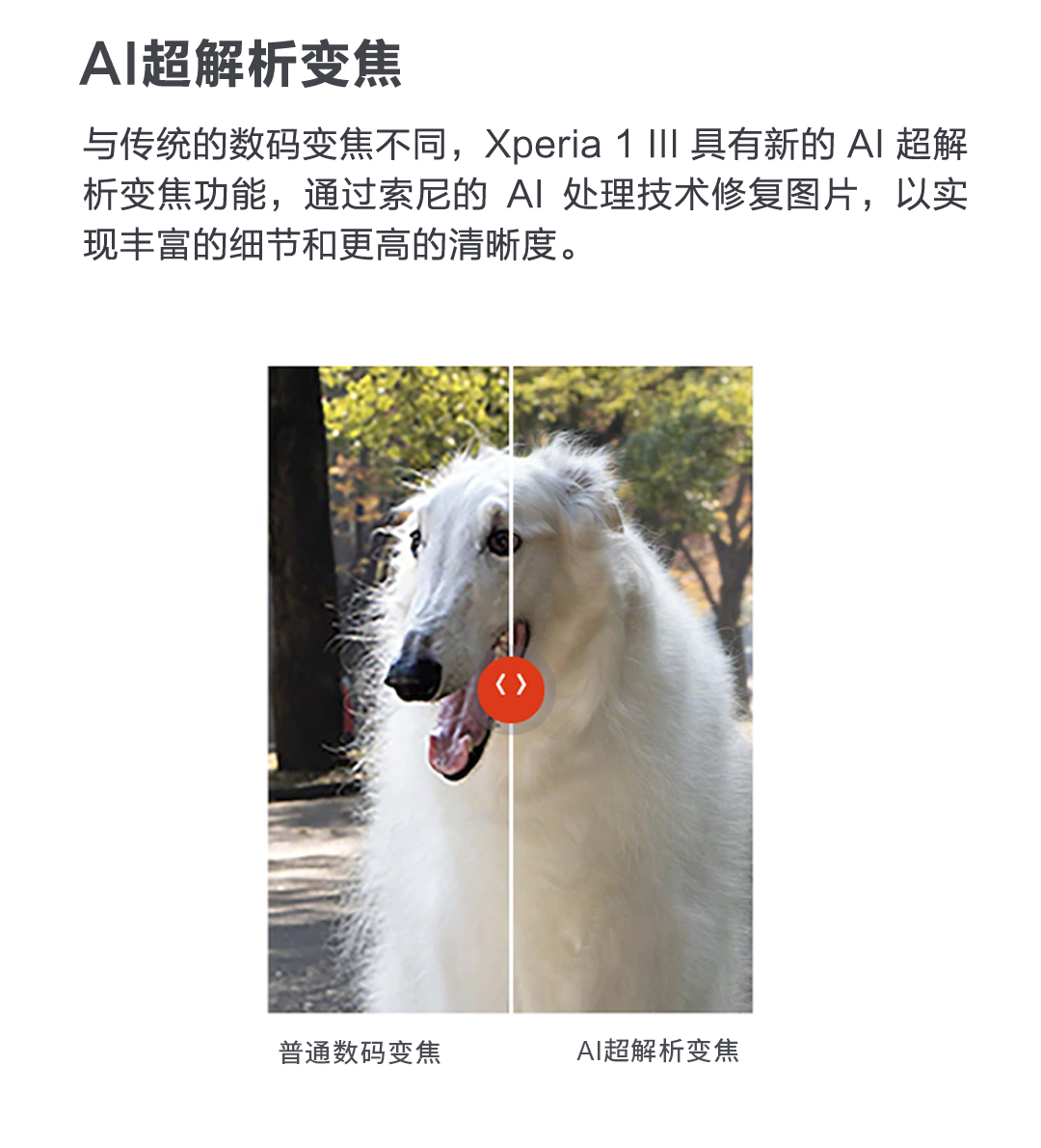 与传统的数码变焦不同,Xperia 1 III 具有新的AI超解析变焦功能,通过索尼的 AI 处理技术修复图片,以实现丰富的细节和更高的清晰度。