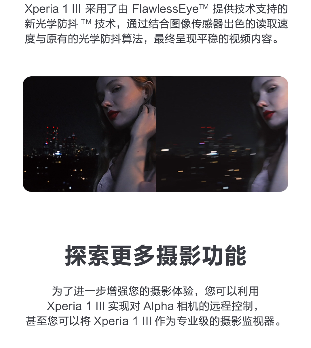 Xperia 1 III 采用了由 FlawlessEye™ 提供技术支持的新光学防抖™ 技术,通过结合图像传感器出色的读取速度与原有的光学防抖算法,最终呈现平稳的视频内容。