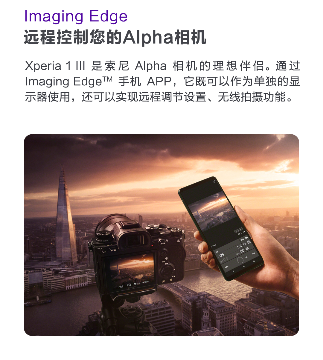 Xperia 1 III 是索尼 Alpha 相机的理想伴侣。通过Imaging Edge™ 手机 APP,它既可以作为单独的显示器使用,还可以实现远程调节设置、无线拍摄功能。