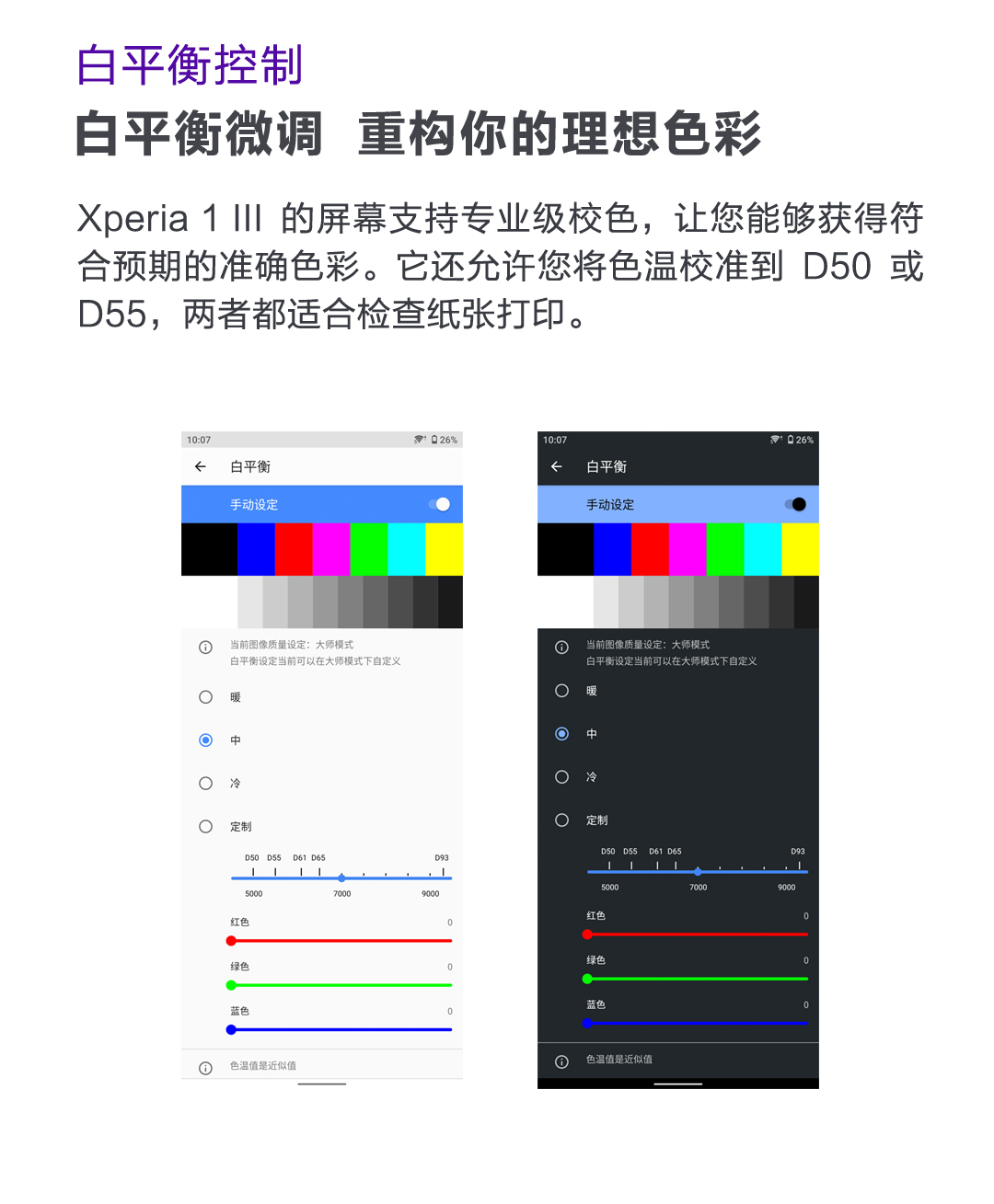 Xperia 1 III 的屏幕支持专业级校色,让您能够获得符合预期的准确色彩。它还允许您将色温校准到D50或D55,两者都适合检查纸张打印。