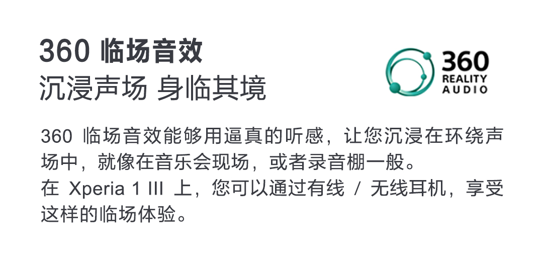 360 临场音效能够用逼真的听感,让您沉浸在环绕声场中,就像在音乐会现场,或者录音棚一般。在 Xperia 1 III 上,您可以通过有线/无线耳机,享受这样的临场体验。