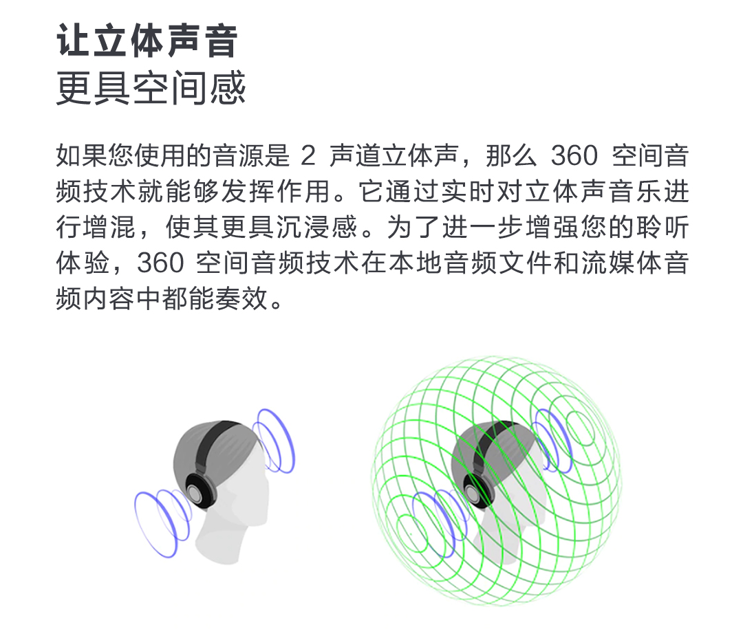 如果您使用的音源是 2 声道立体声,那么空间音频技术就能够发挥作用。它通过实时对立体声音乐进行增混,使其更具沉浸感。为了进一步增强您的聆听体验,360空间音效技术在本地音频文件和流媒体音频内容中都能奏效。
