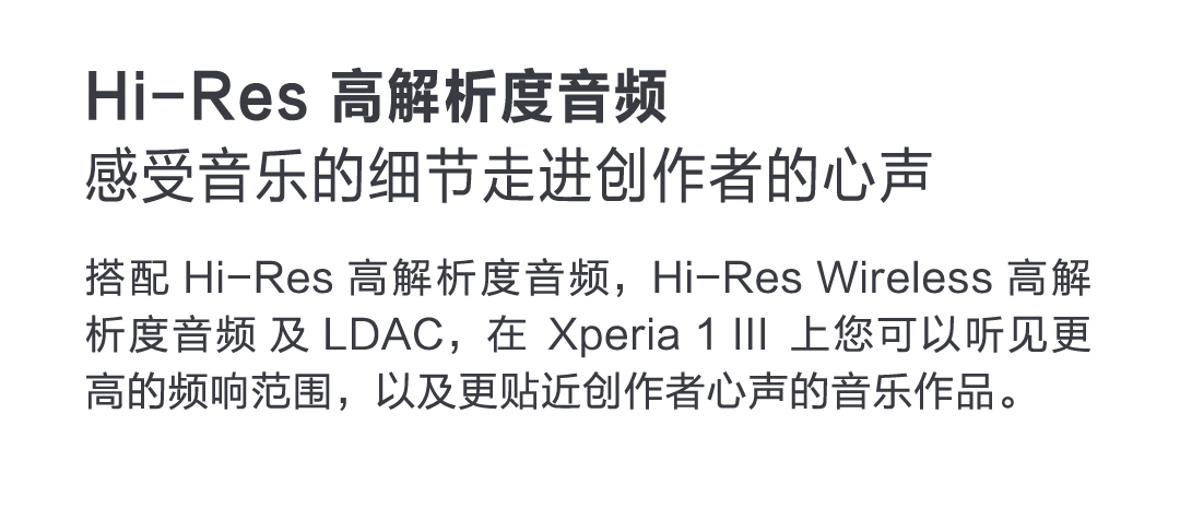 搭配 Hi-Res 高解析度音频,Hi-Res Wireless 高解析度音频 及 LDAC,在Xperia 1 III上您可以听见更高的频响范围,以及更贴近创作者心声的音乐作品。