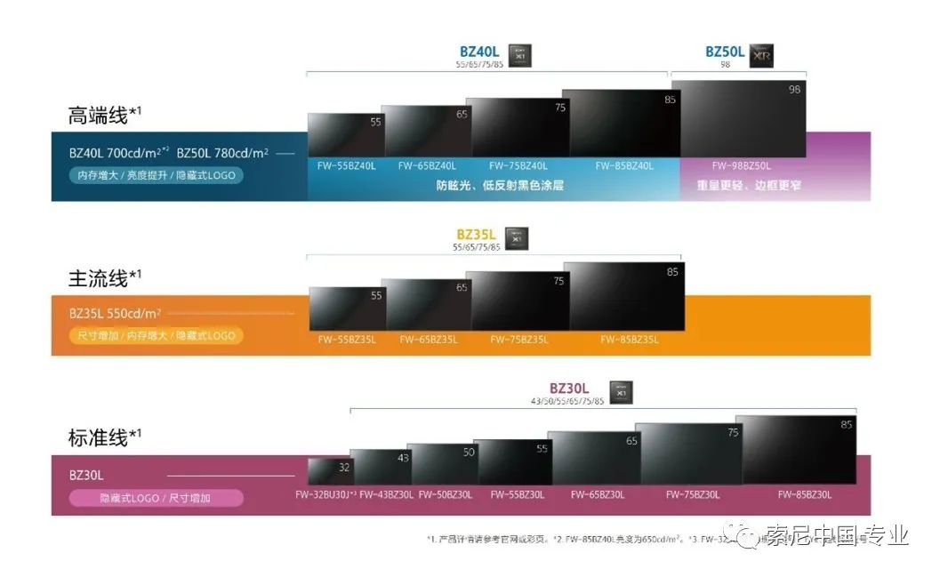 高端线包括BZ50L与BZ40L系列。98英寸的FW-98BZ50L搭载了索尼旗舰的XR认知芯片,亮度高达780cd/m²,是高端零售、高端会议室的理想之选。BZ40L系列是索尼第一次把防眩光和低反射技术融合在一起,采用创新的黑色防眩光&低反射涂层,能实现高达47%的雾度*¹,有效降低反射的同时,依然保持高对比度,提供深邃的黑色和出色的高对比度画质表现,再加上搭载X1旗舰版画质芯片和高亮度(700cd/m²)*¹,特别适合高端零售、高端企业展厅、数字标牌等应用。