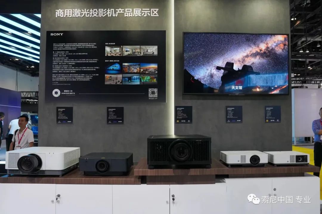 在商用投影机展区,还有索尼VPL-F750HZ等3LCD激光投影机产品线的精彩展示,它们可带来超过100英寸的巨幅大画面,兼容4K/60p信号,内置会议室智能场景设置,能够长时间投影明亮图像,同时也可搭载SIIWS软件,实现智能办公空间方案。此外,更有能为天文馆等高端显示应用场景提供沉浸式体验的4K SXRD激光投影机VPL-GTZ380出现在该展区。