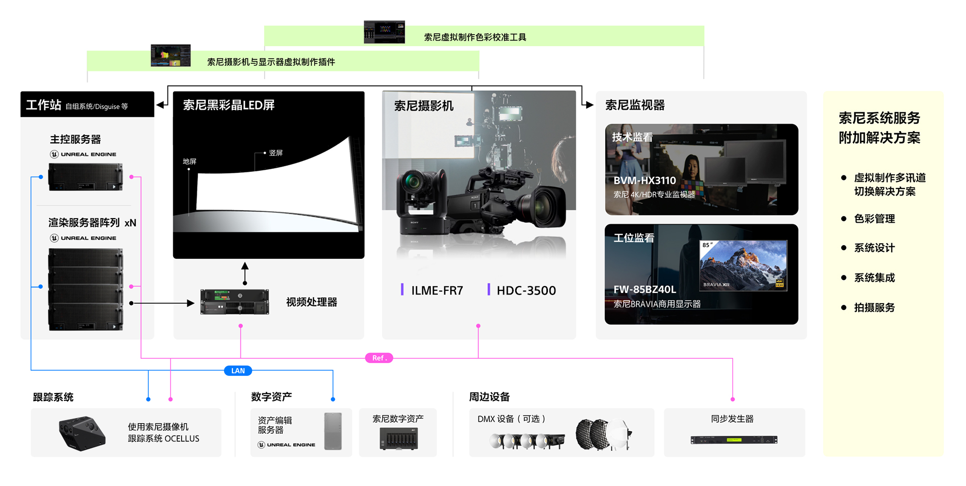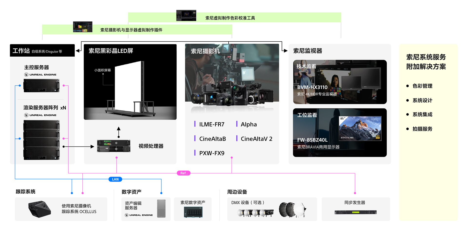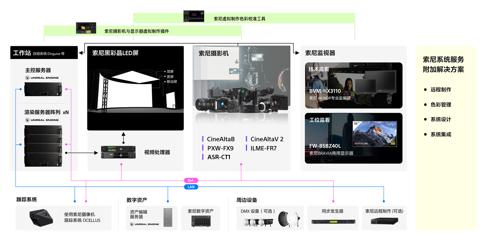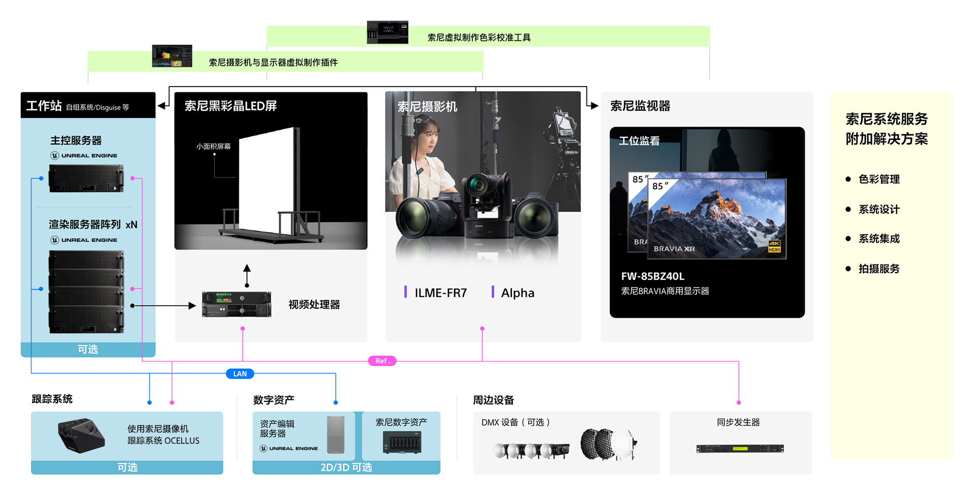 索尼虚拟制作团队秉承“科技赋能创作者”宗旨,旨在通过先进的技术、产品,方案和服务为虚拟制作领域创作者赋能。在实力硬件的基础上,结合虚拟制作工具套装、数字资产平台,节目制作服务,虚拟制作培训等,高标准索尼虚拟制作解决方案,既可采用高质量的完整解决方案,也可灵活构建组合解决方案,满足高品质制作的多样化需求。针对不同行业中各个业务类型的高端虚拟制作应用需求,从显示端、拍摄端到监看端,提供具备索尼虚拟制作优势的专业产品及解决方案,实现高质量、高稳定性、高效益、高灵活性的虚拟制作环境。